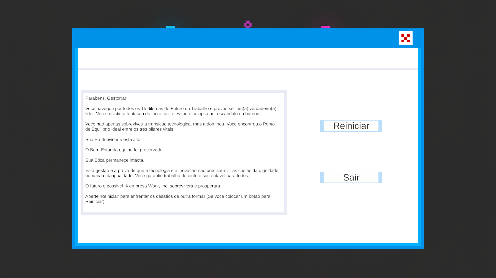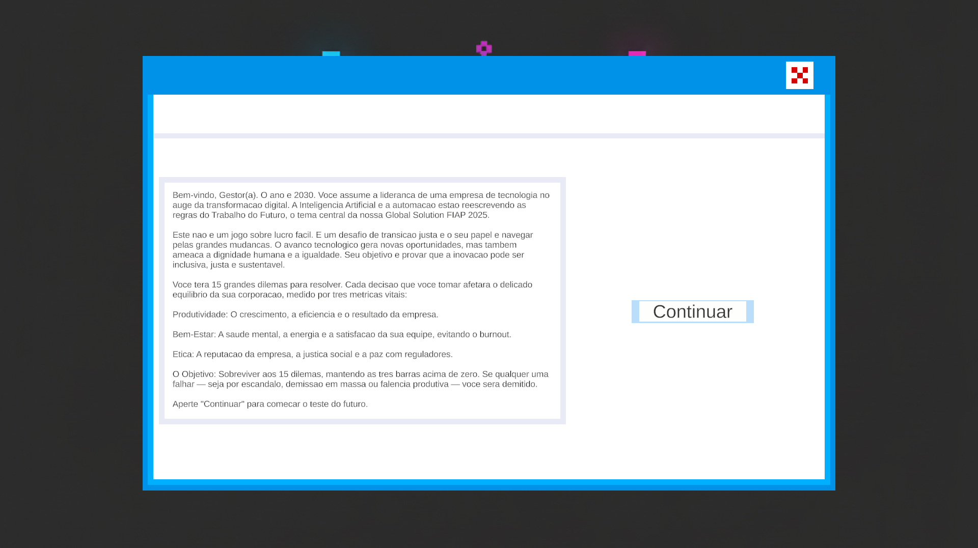 Neste simulador de estratégia e gestão (estilo Reigns), cada decisão importa. Você enfrentará dilemas éticos reais sobre reskilling, inclusão, saúde mental e lucratividade.